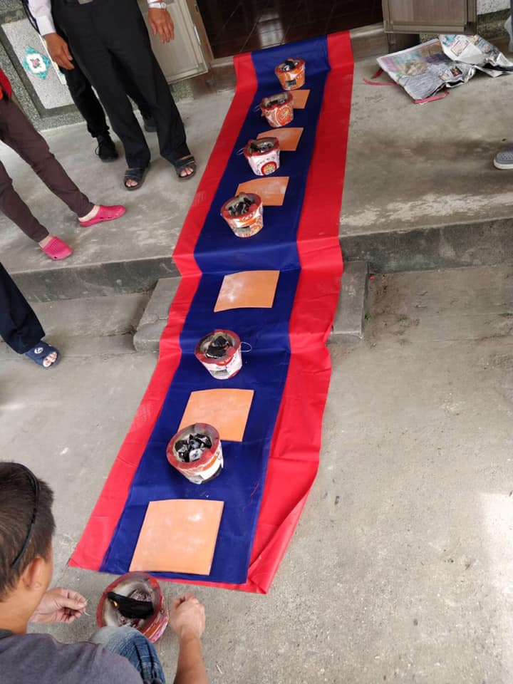 ▼一戶人家在迎娶時,在家門口前面擺上至少7個火爐和瓦片(圖/翻攝自臉書《爆廢公社》)