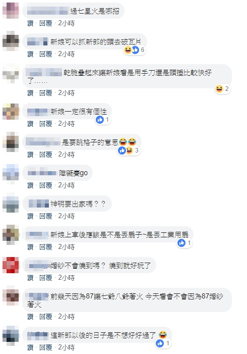 貼文引起許多網友噴笑回覆,有網友以「障礙賽」來形容,也有網友擔心「這會不會過完火,新娘的婚紗都燒起來了」、「就許伴娘團玩人…不許伴郎團玩嗎XD」、「這家的飯碗應該很難捧,過那麼多火爐,要去掉新娘多少脾氣和運氣啊」、「晚上沒洞房,有跪火爐」、「新郎應該是被伴娘整得很慘」