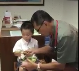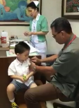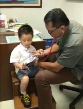 醫師拿著消毒棉花在男童的手臂上反覆擦拭,同時口中哼著像是在玩的重複聲音,但這股涼涼的感覺讓男童恢復警覺,兩眼直勾勾地盯著他的手看,這時,醫師更聰明地拿著棉花在手臂到處亂擦,像是故意擦給男童看「這沒什麼!」,看著醫師一派輕鬆的動作,男童果真放下防備,又重新把目光放在手中的零食上,在此同時,醫師從護理師手中快速接過針劑,以迅雷不及掩耳的速度朝男童的手臂打下一針,男童立刻「啊!」了一聲還轉過頭來。