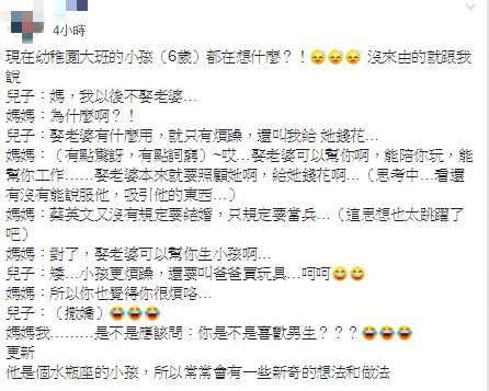 一名女網友在臉書《爆怨公社》中發問,「現在幼稚園大班的小孩(6歲)都在想什麼?」原來,原PO的兒子突然沒來由的跟她說,「媽,我以後不娶老婆。娶老婆有什麼用,就只有煩躁,還叫我給她錢花…。」原PO聽了相當驚訝,心想,如此年幼的小孩怎麼會思考到這麼久遠的事,她想了想接著說,「娶老婆可以幫你啊,能陪你玩,能幫你工作;不過...娶老婆本來就要照顧她啊,給她錢花。」豈料,兒子竟語出驚人地回:「蔡英文又沒有規定要結婚,只規定要當兵。」