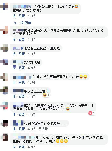 原PO聽完一度陷入詞窮,隔沒多久,她笑回,「娶老婆可以幫你生小孩啊!」但一聽到小孩,兒子居然開始邊嘆氣邊頻頻搖頭,「小孩更煩躁,還要叫爸爸買玩具。」這時原PO終於抓到能反擊兒子的點,決定挖坑給兒子跳,「所以你也覺得你很煩囉!」兒子驚覺自己掉入陷阱,於是開啟撒嬌模式,迅速將話題結束。事後,原PO在文末補充,「他(兒子)是個水瓶座的小孩,所以常常會有一些新奇的想法和做法,我是不是應該問,你是喜歡男生嗎?」貼文曝光後,不少網友紛紛噴笑,「好早熟喔」、「妳該回去問小孩的爸…是不是他的心聲」、「這是爸爸在抱怨的臺詞吧」、「爸爸教的」。