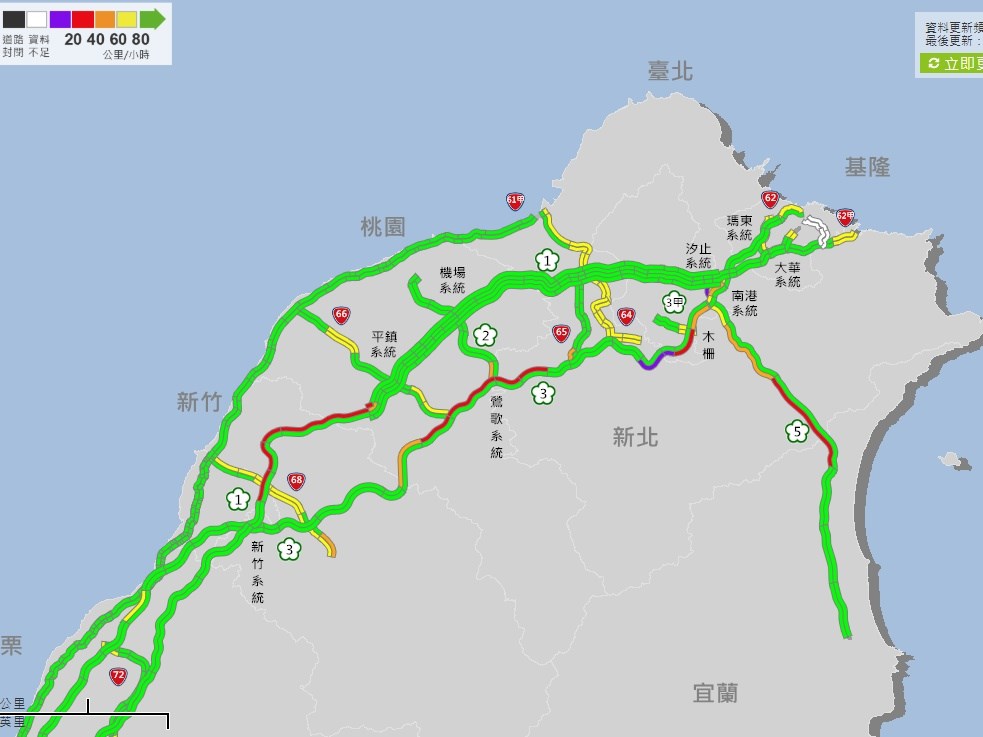 另國1楊梅到湖口、國3樹林到三鶯、國5石碇到頭城車流量也較大,行車時速為40到60公里。