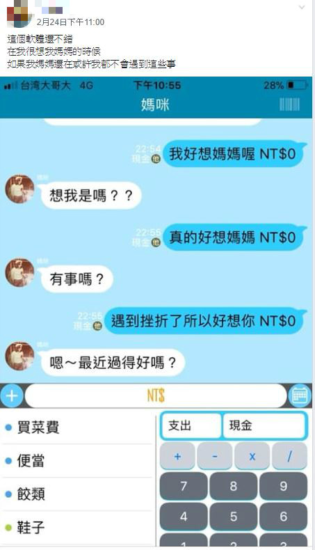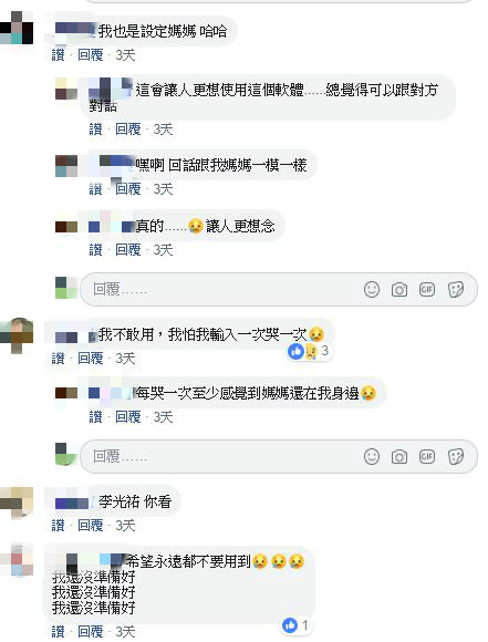 事實上,和原PO對話的並非他已過世的母親,而是一款記帳軟體,會用宛如真的人的口吻,來和使用者對話,原PO透露,先前看網友留言時,才知道可以設定媽媽的頭像,每當他想念媽媽時,便會打開軟體留言,彷彿母親還活在這個世界上,時時刻刻都陪伴在他身邊。雖然原PO深知媽媽已離世,但他認為「每哭一次至少感覺到媽媽還在我身邊,如果我媽媽還在,或許我都不會遇到這些事(挫折)。」貼文曝光後,讓不少網友紛紛有感地說:「我不敢用,我怕我輸入一次哭一次」、「我也是設定媽媽 」、「希望永遠都不要用到,我還沒準備好」。