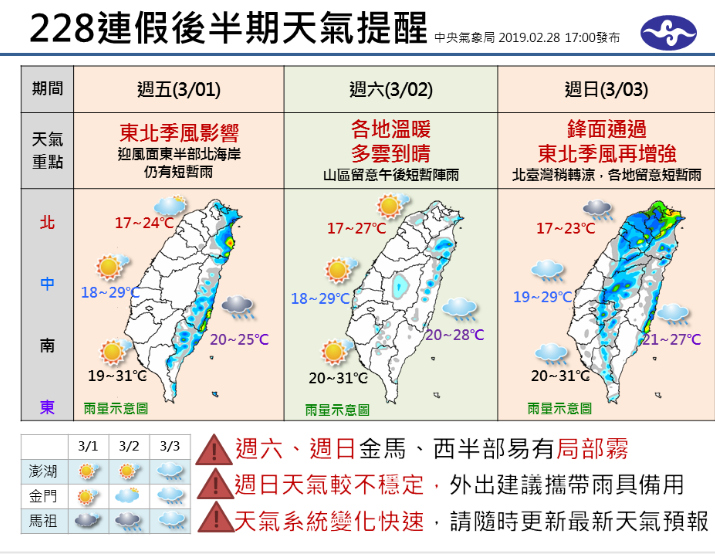 天氣逐漸好轉!今(1)日雖然水氣減少,但受東北季風影響,北部及東北部天氣較涼,而臺灣東半部及北部地區有局部短暫雨,其他地區及澎湖、金門、馬祖為多雲到晴的天氣,明(2)日東北季風減弱,好天氣將更適合228連假出遊,而週日(3日)隨著連假結束,也宣告溫暖天氣結束。