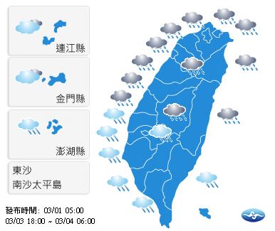 中央氣象局指出,今日東半部及北部地區有局部短暫雨,天氣也較涼,而其他地區則是多雲到晴,明日東北季風減弱,氣溫回升;臺灣各地及澎湖、金門大多為多雲到晴,僅東半部地區及馬祖有局部短暫陣雨,午後其他山區有零星短暫陣雨,臺灣西半部地區及金門、馬祖易有低雲或局部霧影響能見度。