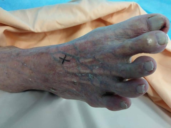 ▼老伯就醫時,右腳趾頭已明顯發黑。(圖/高醫附醫提供)