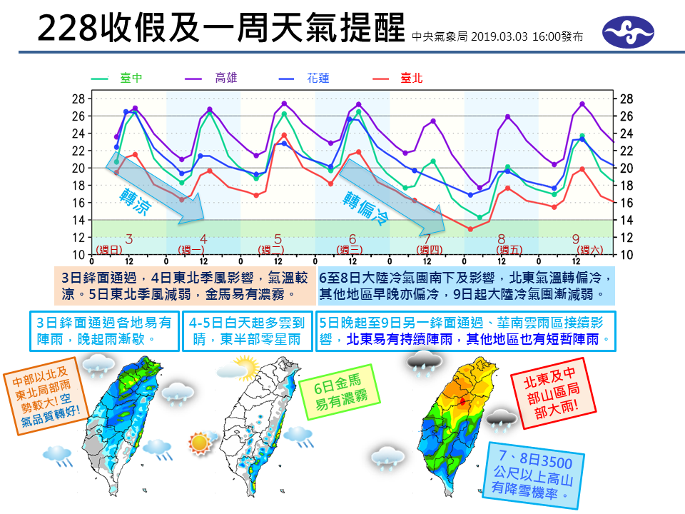 不過好天氣恐怕只會持續到周二(5日)晚間,周三起至周日(6日至10日)鋒面通過後又有華南雲雨區持續東移,水氣明顯偏多,各地天氣都相當不穩,恐怕全台有雨,北部及東北部更要注意局部大雨,且周三下半天大陸冷氣團南下,全台又濕又冷,北台灣更是急凍,氣溫狂掉剩12度,另外,周四、周五(7日、8日)為冷氣團影響最明顯的時候,北台灣低溫12、13度,中南部、東半部則約為14度,3500公尺以上高山可能下雪,周六、周日(9日、10日)隨著大陸冷氣團減弱,氣溫也會逐漸回升,下周一(11日)至下周三(13日),各地仍有短暫陣雨,不過台灣附近水氣也將逐漸減少。