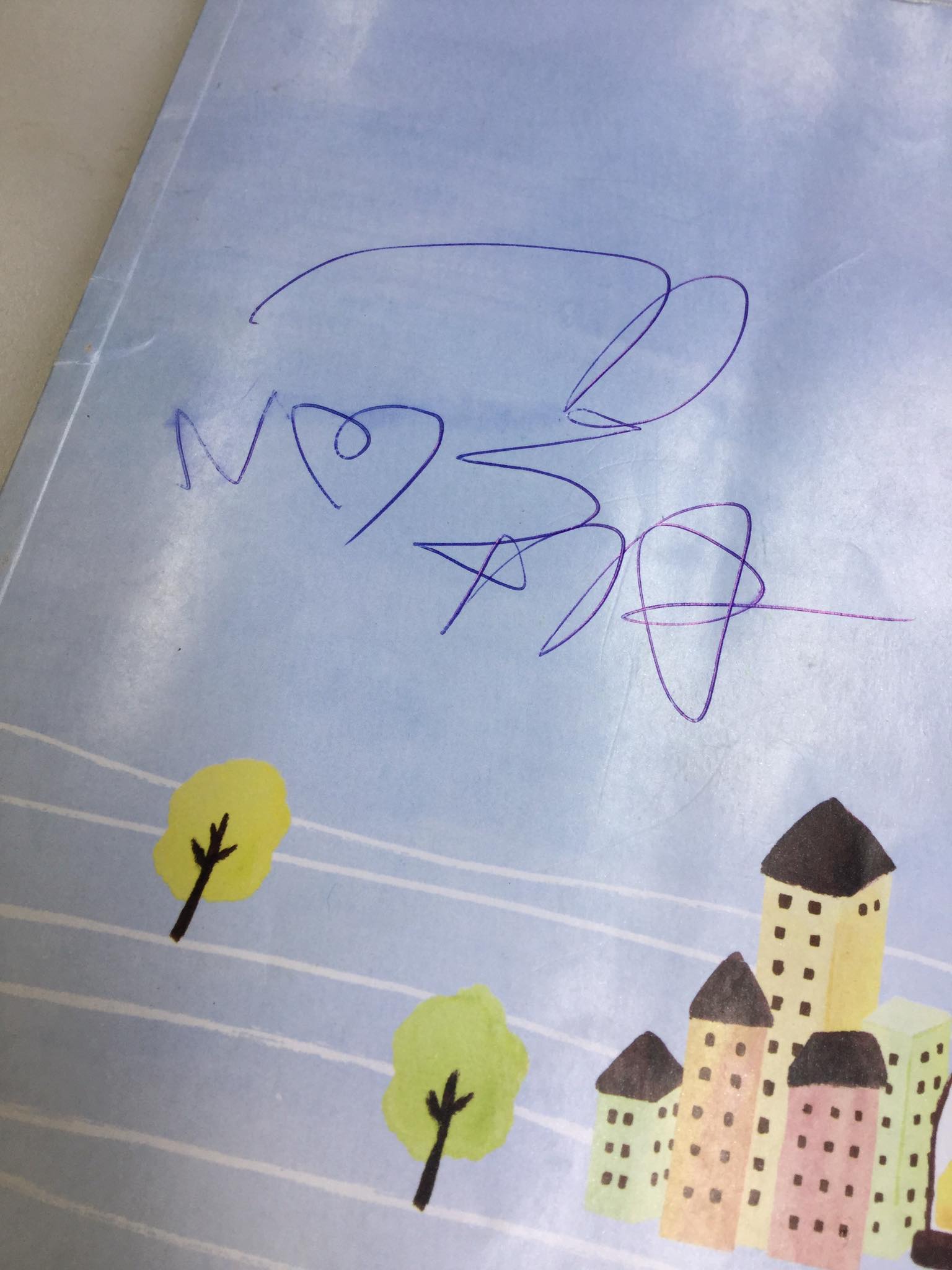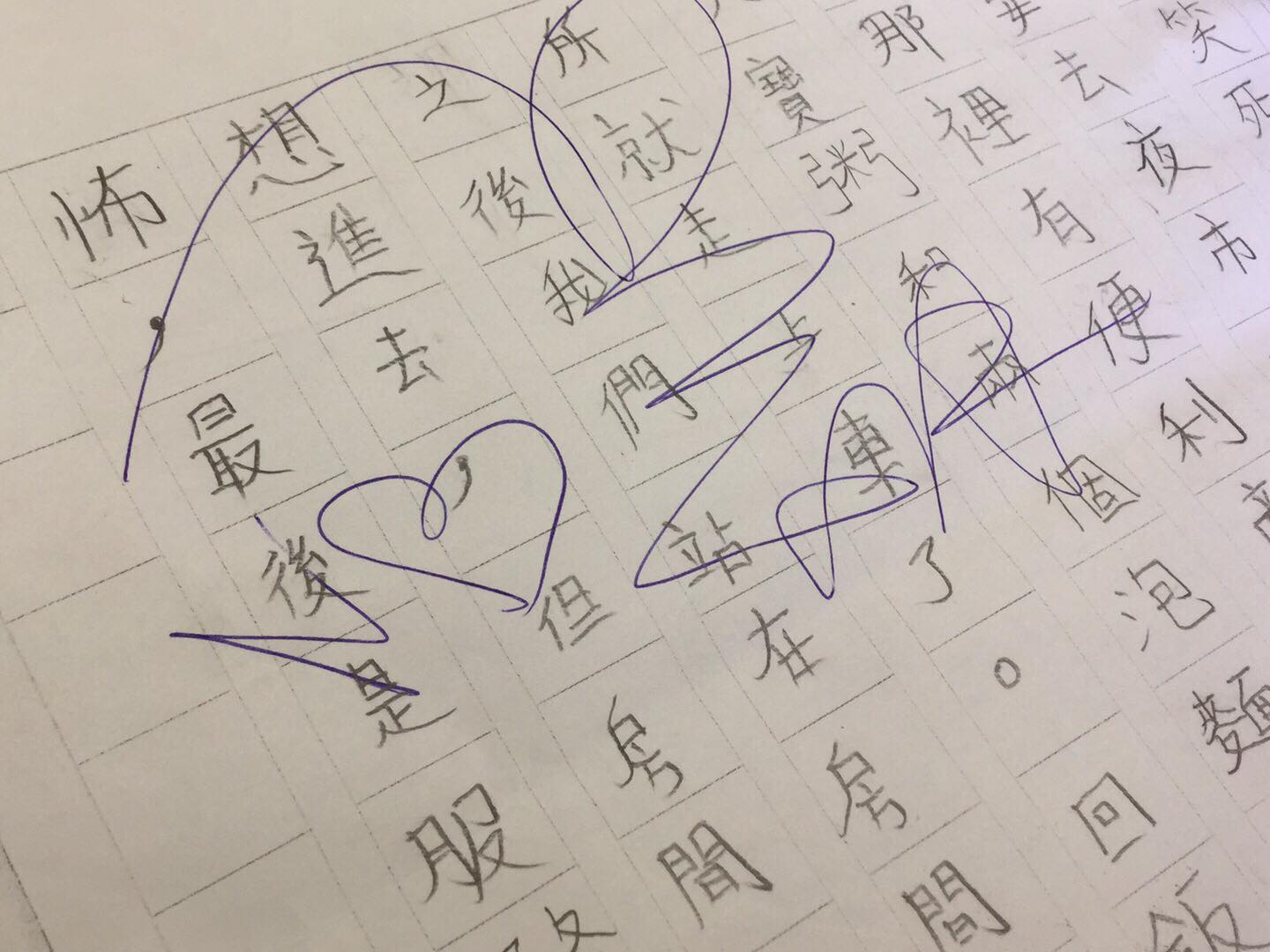 仔細一看,第一張照片的阿翔2個字,就大大地寫在聯絡簿的下方空白處,不過第二張照片就讓原PO頭疼了,「他(阿翔)簽時小孩還沒寫作業,是空白的稿紙」,阿翔起初以為是張沒有作用的紙張,便霸氣地簽下名,怎料,學生完全沒解釋這張是要拿來寫作業的,於是就鬧出笑話,只見稿子上的每個格子裡都是學生寫的文字,但上頭卻印著藍色阿翔的簽名字跡,讓原PO笑說「(這是)今天交來的作業…」。