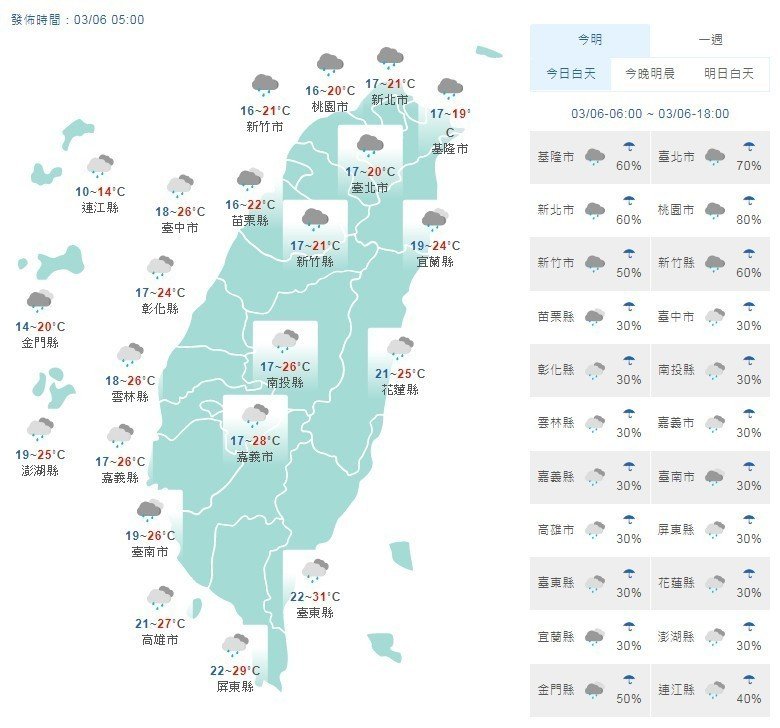 預估中部以北及東北部低溫僅11至13度,南部及花東約15至17 度,清晨及夜裡對寒冷的感受最明顯,明日起一直到周日(10日),水氣明顯偏多,由於7、8日受到華南雲雨區東移影響,9、10日兩天則有鋒面通過,各地天氣不穩,可能會有雷雨機會,局部地區也有降大雨的可能。