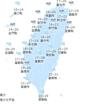 氣象局指出,今日北台灣低溫約15度左右,高溫大約20至22度,中南部及花東高溫約28至31,低溫約18至19度,請注意氣溫的變化,明、後天(7、8日)在大陸冷氣團影響之下,北台灣溫度將持續下降,又以北台灣最為明顯。