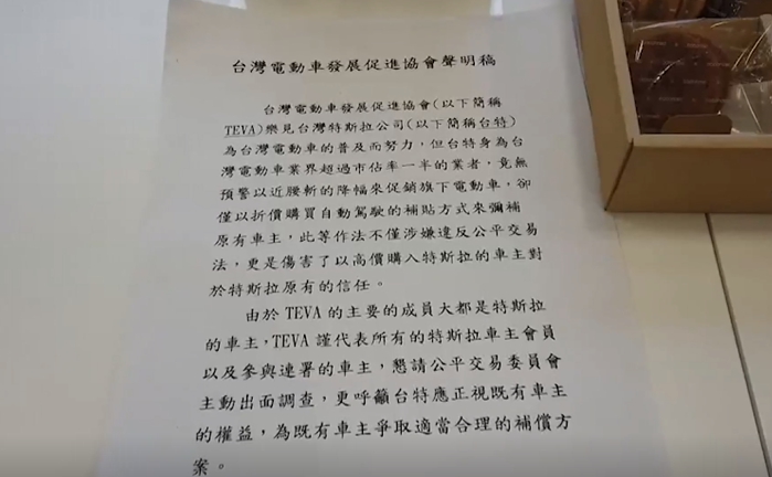 數十名特斯拉車主聚集在房間內,忙著簽署連署書,因為特斯拉總公司1日臨時宣布大降價,引發部分車主不滿,發動連署,並以台灣電動車發展促進協會的名義,發表聲明稿,表示這次降價傷害了以高價購入特斯拉的車主,對特斯拉原有的信任,並希望公平交易委員會介入調查,而屋漏偏逢連夜雨,除了降價引發爭議,特斯拉準備在中國出售的新車款,也被爆出遭到海關扣留。