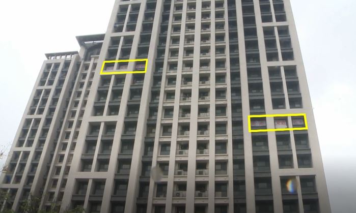 仔細一看大樓左邊窗戶,室內貼上白色紙張,手寫的2個冤字,右邊則是有6個,加起來總共8個冤,民眾議論紛紛是賣不出去嗎,更臆測搞不好是凶宅。