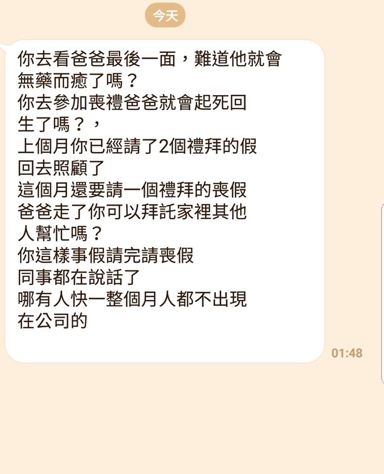 只見老闆在訊息中對原PO的友人說道:「你去看爸爸最後一面,難道他就會無藥而癒了嗎?你去參加喪禮,爸爸就會起死回生了嗎?上個月你已經請了2個禮拜的假回去照顧了,這個月還要請一個禮拜的喪假,爸爸走了,你可以拜託家裡其他人幫忙嗎?你這樣事假請完(換)請喪假,同事都在說話了,哪有人快一整個月都不出現在公司的。」一番言論毫無同理心,原PO見狀後氣得替好友打抱不平,怒批:「喪假都還沒請完,爸爸都還沒出殯,老闆就一直叫他(好友)趕快回去上班,台灣的X掰老闆怎麼都不去火化算了?」