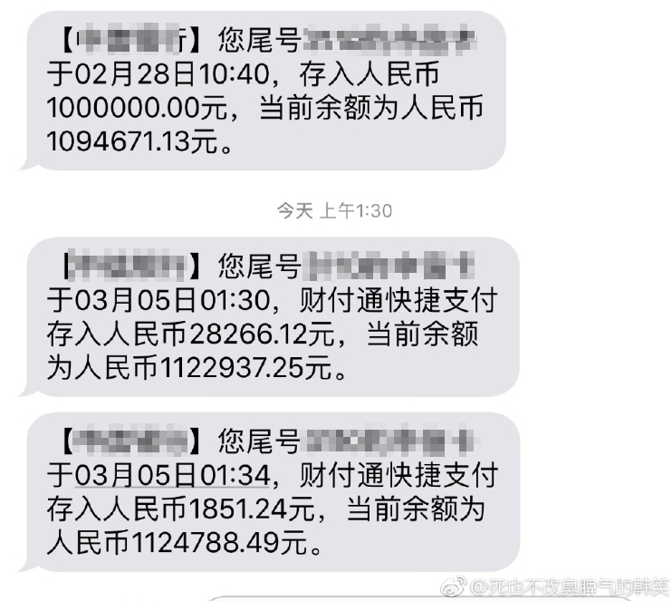 ▼韓笑貼出媽媽給100萬人民幣當零用錢的轉帳明細。(圖/翻攝自死也不改臭脾氣的韓笑微博)