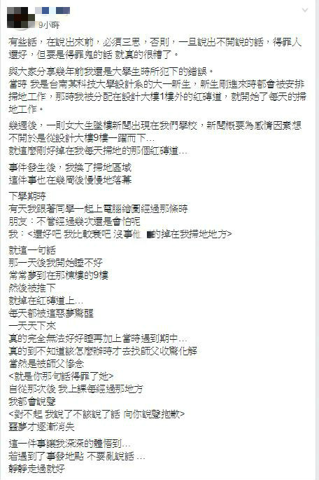 男網友在臉書「靈異公社」發文,他表示,大一新生一入學時,都會被安排打掃工作,他則被分配到設計大樓1樓外的紅磚道,怎料,入學沒幾週就有一位女學生跳樓輕生,原PO透露,當時新聞提到,女學生是因遇到感情問題,所以才從設計大樓9樓一躍而下,但當下他不以為意,只覺得為何「就這麼剛好掉在我每天掃地的那個紅磚道…。」事情發生後,原PO換了打掃區域,校園也隨著時間慢慢回歸平靜。到了下學期,某天原PO和同學去上課的路上,恰巧經過了那條紅磚道,同學有些恐懼地說:「不管經過幾次還是會怕呢…」原PO一聽沒好氣回:「還好吧,我比較衰吧,沒事他X的掉在我掃地的地方」。