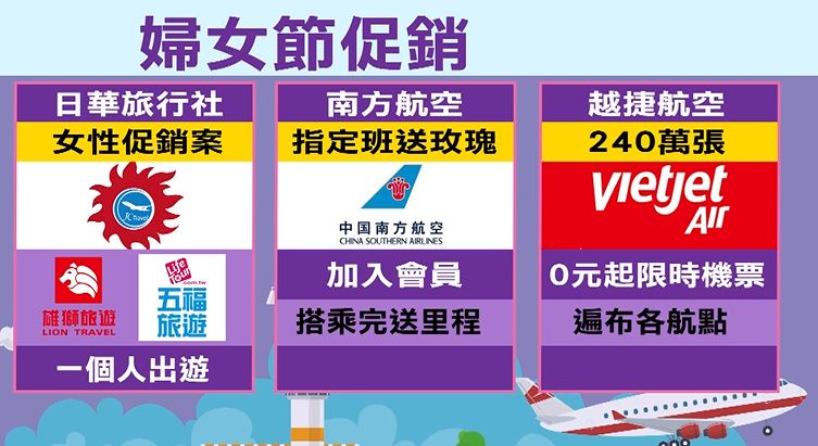 額滿就恢復原價,其他旅行社甚至推出一個人自由行。航空業也不缺席,陸籍航空在38婦女節這天,指定航班上送女性旅客玫瑰,當天註冊成會員,4月底前再搭乘就加碼送里程。