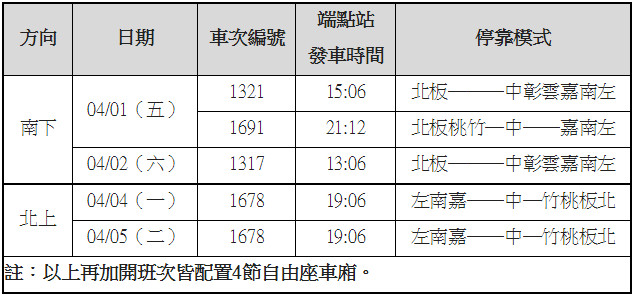 為了疏運即將到來的清明連假,高鐵決議加開5班次列車,南下3班、北上2班,另加開的5班次列車,皆配置4節自由座車廂,於3/25日凌晨開始開放預購。