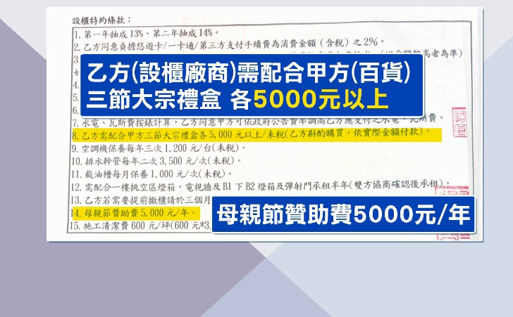 繳了尾牙費,卻不能帶櫃上的工作人員一起參加尾牙,這筆款項,A先生說當初簽約的時候就沒寫在合約裡,看看當初A先生跟微風簽的合約,第一年抽13%,第二年往上加抽14%,另外設櫃的廠商同意百貨可依政府公告費率,調高水電、瓦斯費,再來廠商須配合百貨三節購買禮盒各5000元以上,每年的母親節也要贊助5000元。