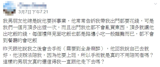更扯的是,她日後要開刀,因為需要全身麻醉,希望男友能陪她到醫院,結果男友不以為意,直接打槍她「沒辦法陪妳,我要上班」,連一絲絲的關心都沒有,讓原PO無敵痛心,直呼「所以手術就是真的不用陪同嗎?這樣的男朋友真的還值得我一直跟他走下去嗎?」