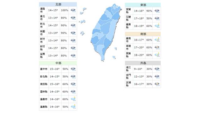 而氣象局也發佈了低溫特報,提醒苗栗以北及宜蘭、金馬空曠或沿海地區從明晚開始到週六清晨將出現10度左右的低溫,其中北部預估低溫約9到11度,中部及宜蘭約10到12度,南部及花東約13到16度,尤其這幾天是容易下雨的天氣,會特別