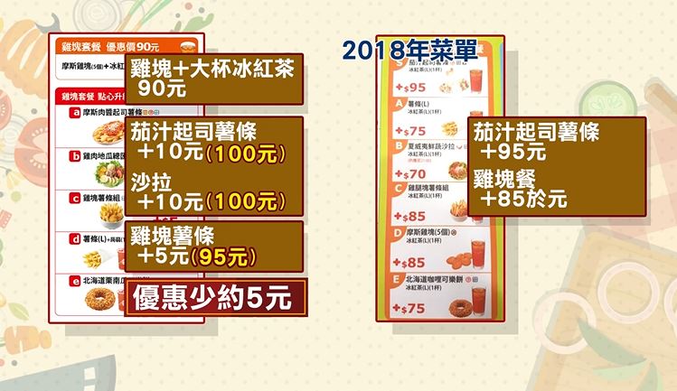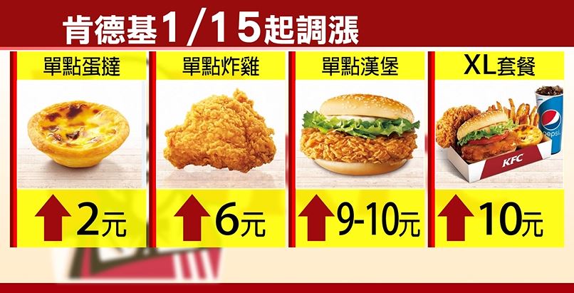 肯德基則是在1月15日起調整價格,單點蛋撻比以前貴2元,單點炸雞也調漲6元,單點漢堡,每個漲了9到10元不等,各速食店紛紛喊漲優惠縮水,民眾荷包跟著縮水。