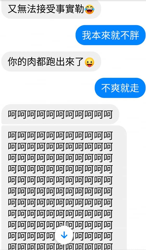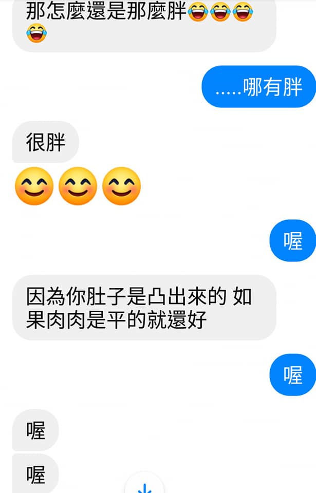 原PO在臉書《爆怨公社》貼出對話紀錄,淚喊「我跟你在一起,不是為了討你開心,把自己變成你喜歡的樣子」。只見男方傳訊息給她,語氣不善地嘲笑「怎麼還是那麼胖」、「因為妳肚子是凸出來的,如果肉肉是平的就還好」、「妳的肉都跑出來了」,她無奈回應「哪有胖」,希望對方停止言語羞辱,怎料反而開啟對方的開關,不斷傳訊息譏笑「又無法接受事實」、「妳很愛自我安慰」、「要爆氣囉,要惱羞囉」,還狂傳「呵呵呵」洗版。