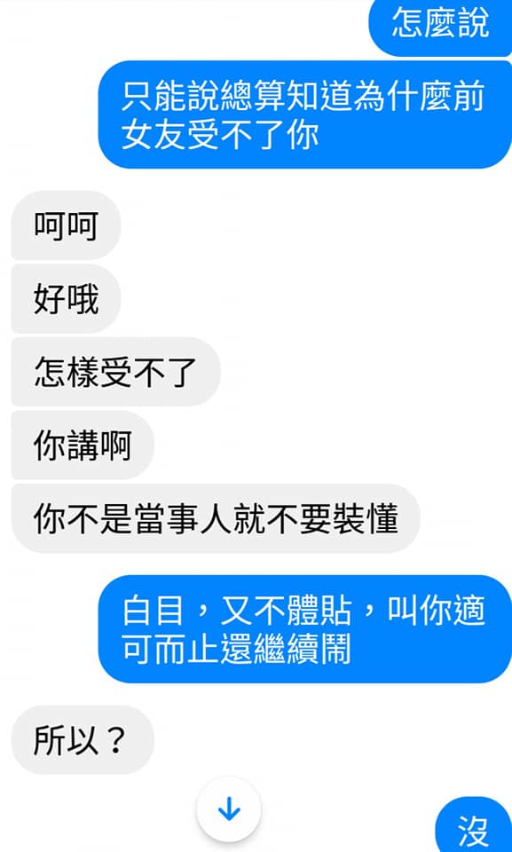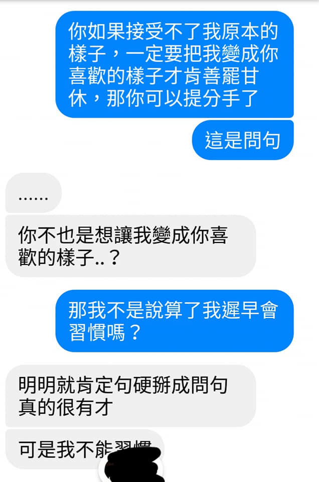 「我喜歡現在的自己,你無權要求我變成你喜歡的樣子!」一名長相甜美、身材纖細的女網友感嘆,男友動不動就嫌她胖,甚至嘲笑她「肚子凸出來」,令她非常無奈,且對方一度狂傳「呵呵呵呵呵呵」洗版,譏笑意味濃厚,她實在忍無可忍,要求男友停止不禮貌的舉動,怎料對方還反酸她「惱羞成怒」,最後她實在受不了羞辱忍痛斬斷戀情,痛訴「就算知道不值得還是哭到腦袋缺氧了」,讓看完兩人對話的網友全都好心疼。