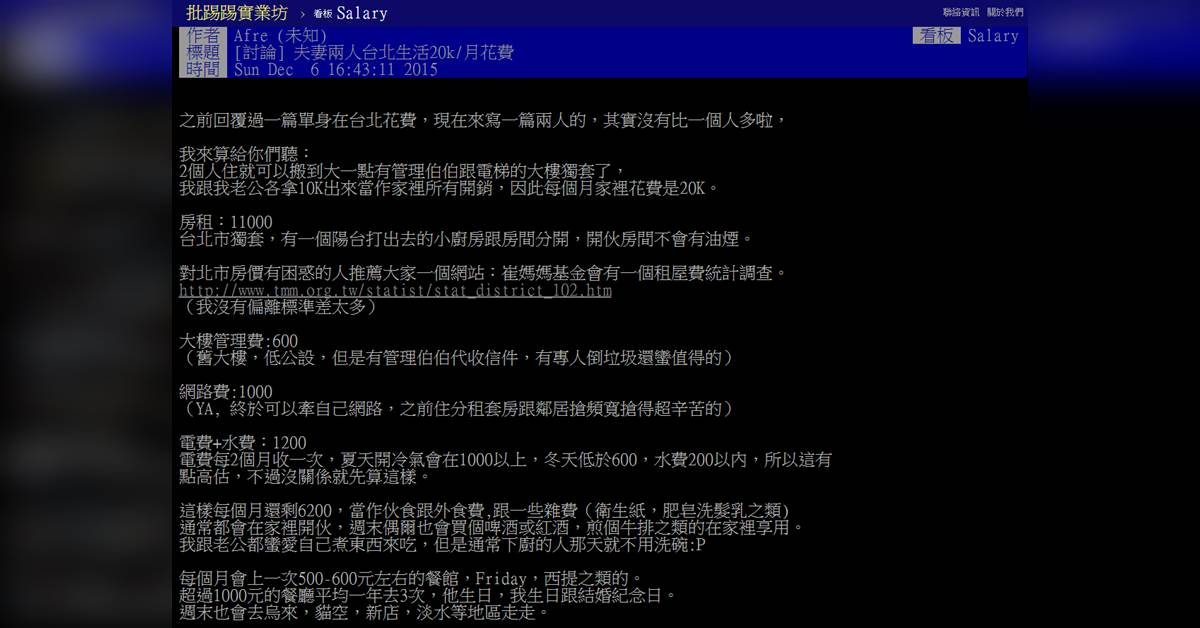 省錢人妻,在批踢踢上的Salary板PO文表示,她和老公兩個人在台北上班、租屋、吃喝、休閒遊憩等,每個月竟然只花20K就包辦一切,這也太厲害了吧!