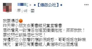 這名女網友在臉書「爆怨公社」中發文,她表示,自己趁著周末帶小朋友到家裡附近的圖書館看書,怎料,她一進到「兒童閱覽室」,就看見一對情侶正躺在木地板上,2人似乎相當投入在愛戀的氛圍中,並將視線完全停留在彼此身上,絲毫不在乎旁人的眼光,期間2人你儂我儂,不斷地卿卿我我、摟摟抱抱,男方甚至望情地緊摟著女生的腰,激情地交纏著,彷彿整個兒童閱覽室只剩下他們2人。