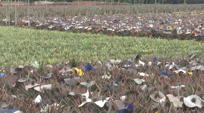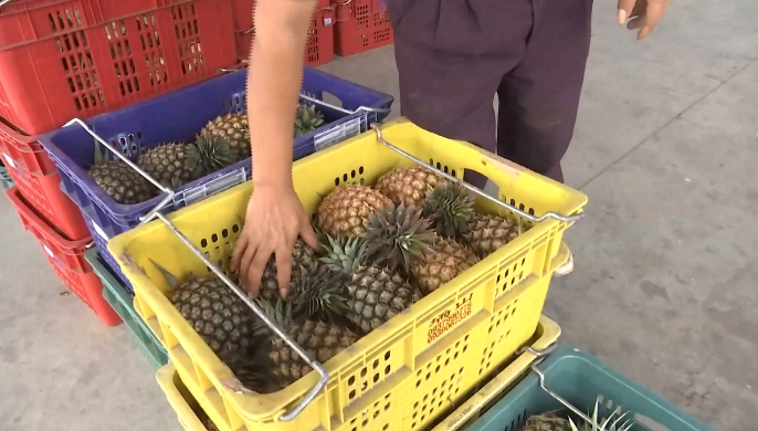 各種顏色的籃子裡裝滿了鳳梨,光是現場恐怕就有上百顆,不過原本應該開心的大豐收,卻讓農民有苦說不出,因為今年暖冬造成鳳梨產季提前,生產量遠大於收購量,讓價格直直落,就算最高等的鳳梨,一台斤也只剩5塊錢,讓農民賣越多賠越多。