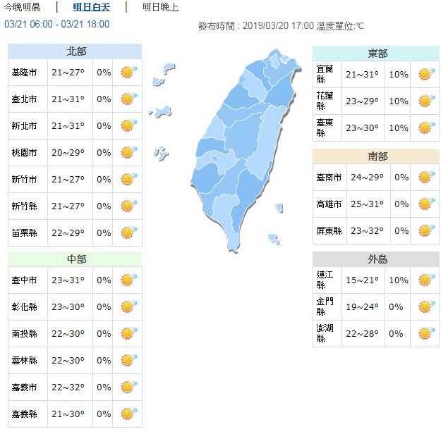 中央氣象局表示,今天(20日)各地有些熱,屏東楓港達33.7度的高溫,屏東縣春日及高雄市月眉今日最高溫也都飆破33度。氣象局預測,明天(21日)台灣各地高溫依舊,北台灣高溫可能達31度,中南部有可能飆破32度。不過週五(22日)將有鋒面通過及東北季風增強,中部以北、東半部地區及南部山區將轉為有短暫陣雨的天氣型態,北部及東北部天氣明顯轉涼,高溫和明天相比有近10度左右的降幅,提醒北部及東北部的朋友,雖然週四溫暖微熱似夏天,週五則乍暖還寒猶如冬天,要特別留意明後兩天氣溫驟降受涼。