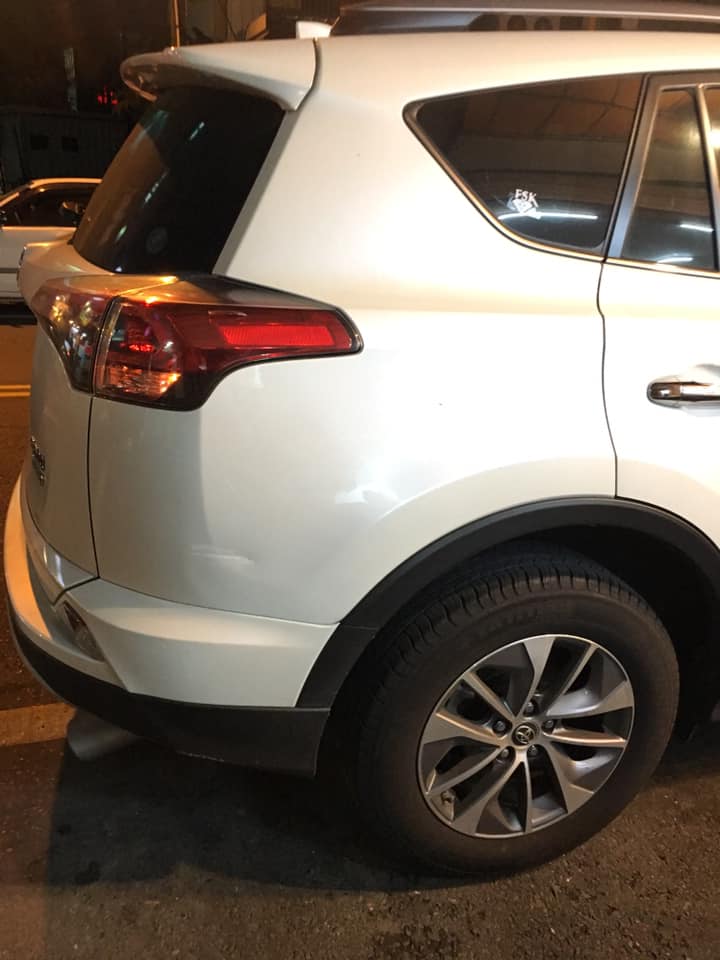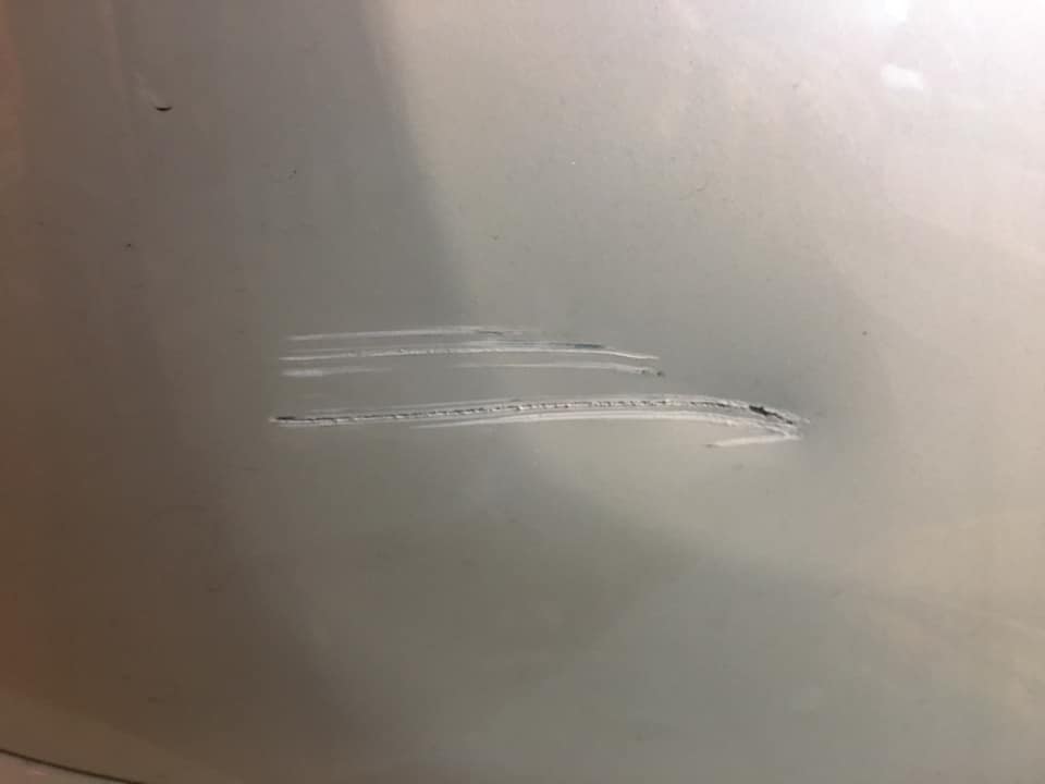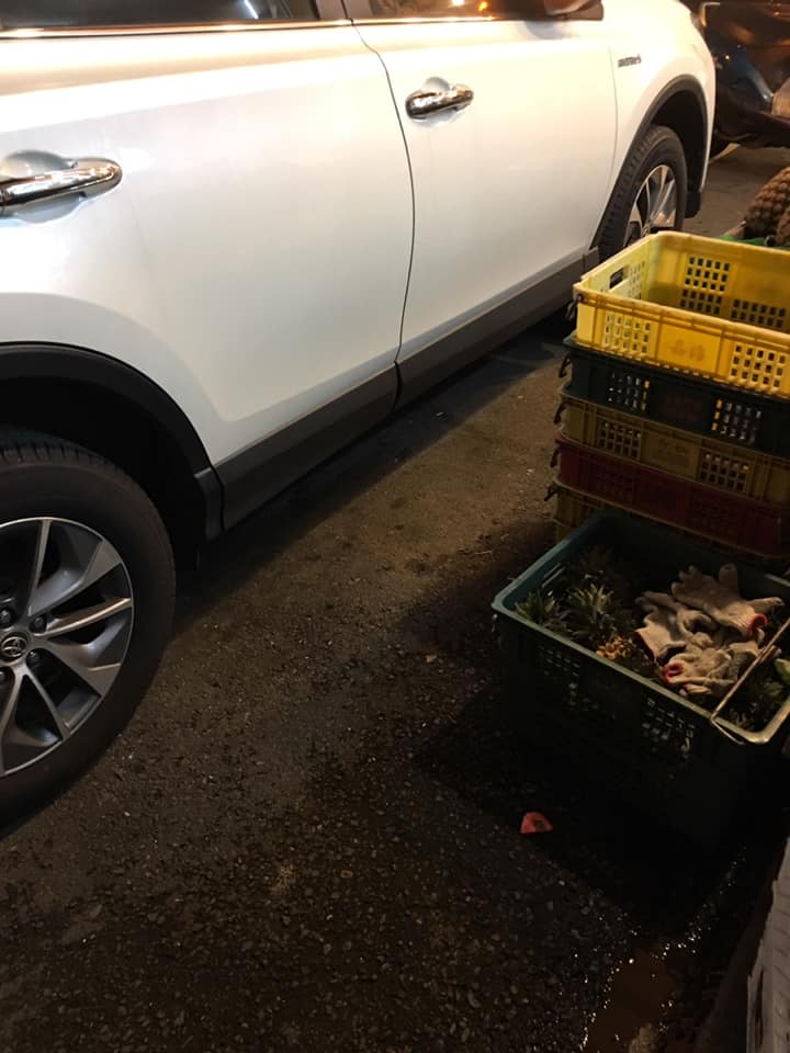 原PO在臉書《爆怨公社》發文,透露22日晚間上班時,她把塑膠籃子拿出去外面丟,一疊一疊放好,當時旁邊停了一輛白色轎車,沒想到過了2分鐘,車主下車不滿地表示:「小姐,妳丟到我的車了,妳不知道嗎?」照片中可見車身被刮了明顯的凹痕,但她認為事有蹊蹺,「根本就沒丟到好嗎?痕跡方向也不對,我也沒丟那麼遠」,因此調閱了監視器,偏偏該地正好是監視器死角,沒有拍到,原PO的老闆娘便建議,「我們報警請警察來協助好嗎?」強調丟籃子會由上往下劃直線,而不是劃橫線,但車主卻一直狂盧:「不是妳用的,會是誰用的?」