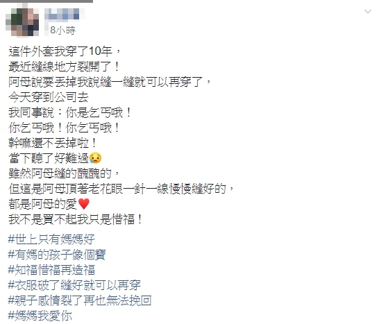 同事的一番犀利言語刺進他的內心深處,原PO難過地解釋,雖然媽媽縫得不太美觀,針線的顏色也很突兀,「但這是阿母頂著老花眼一針一線慢慢縫好的,都是阿母的愛」,似乎只要穿外套,看到密密麻麻的縫線,內心都會感到溫暖,他表示不是買不起外套,認為有一顆惜福的心很重要,「知福惜福再造福,衣服破了縫好就可以再穿」,無奈同事為何要批評。