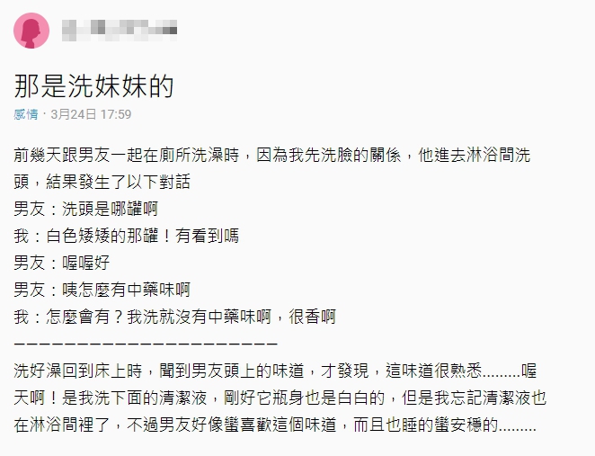 兩人洗完澡後一起躺到床上,準備相擁入眠,此時原PO才聞到男友所說的「中藥味」,發現這個熟悉的味道,竟是她用來洗私密處的清潔液,由於清潔液和洗髮精的罐子都是「白白的」,男友才會用錯,讓她忍不住驚嚇吶喊「喔天啊!」不過男友完全沒發現異狀,頭頂著「私密處」的味道依舊好眠,讓她哭笑不得,直呼「男友好像蠻喜歡這個味道」。