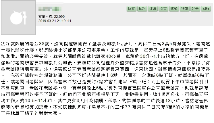 一名網友在論壇《mobile01》分享朋友鄰居老公的故事,38歲的他沒有任何司機的工作經驗,他刷掉不少競爭者,終於應徵上董事長專屬司機的工作,目前已經工作1個多月,有周休二日且含健保,「老闆吃什麼他就吃什麼,幾乎都是路邊攤」,餐費的開銷也都是用公司零用金支付。雖然看起來司機不需要掏出一毛錢,且福利也不錯,但工作內容卻不僅僅只是「當司機」而已,每天早上8點要到老闆家整理車子,準備好必需品後,接著等老闆睡醒,載對方到40公里外的公司,車程約半小時至1小時,至於下班時間表定是晚上6點。