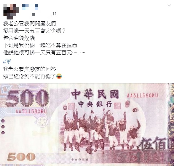 一名人妻在臉書社團「爆廢公社」中發文指出,她每天都會給老公500元的零用錢,其中包含油錢、菸錢,但下班後夫妻倆一起吃飯則不算在內,無奈老公卻覺得錢很少,「自己很可憐」,於是要求她上問問其他網友:「零用錢一天五百會太少嗎?」