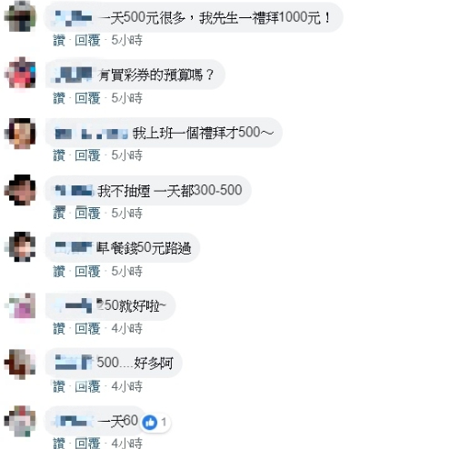 貼文一出,網友們紛紛回應:「羨慕你老公每天有500零用錢,這樣算下來一個月就有1萬5千元,真是太幸福了」、「真好!我100都沒有」、「500真的很多了,要知足啊」、「不包晚餐一個月還可以花到1萬5千元,佩服」、「我上班一個禮拜才500」、「早餐錢50元路過」、「我一天才200,含油錢就300」、「我給老公一天300,他還可以有多餘的錢網購」、「我老公100」、「我一天100就夠了,月底我還可以請你吃大餐」。