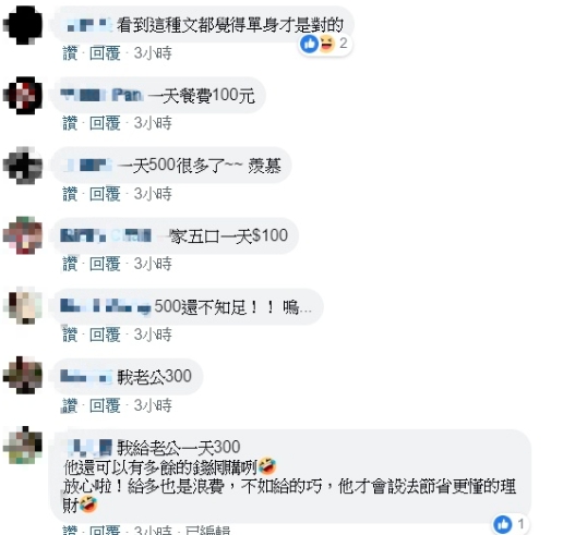 不過,也有網友說:「我們男生疼老婆的下場」、「還要交際費、休閒娛樂費,這是老公的標準配備好嗎」、「看到這種文都覺得單身才是對的」、「看收入而定吧,如果一天可以賺5千,一天給1千也不過分」、「出門在外要有臨時錢啦各位」。