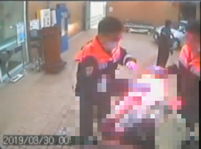 ▼救護人員引導產婦分娩,全程不到兩分鐘,才剛到醫院大門就順利生產。(圖/東森新聞)