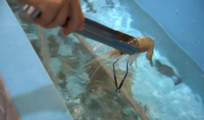 ▼一名男子把水池裡面的蝦子夾起來重摔,導致死了好幾隻蝦子(圖/東森新聞)