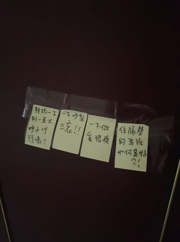 原PO今(2)日凌晨1點38分在臉書《爆怨公社》發文,無奈表示:「真的受不了租房鄰居很吵的」,她透露隔壁房情侶吵架,不久前說要跳樓,過沒多久又突然和好,2人正在床上交纏超歡愉,氣得痛罵:「亂七八糟」,更揚言很想公布地址,「煩死了」。由於聲音之大,影響到她睡眠,她寫了好幾張紙條,寫著「拜託一下,別一直大呼小叫行嗎?」、「一下吵架滾!一下XX很爽,住隔壁的我該如何是好?!」特地貼在門上。