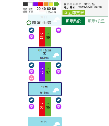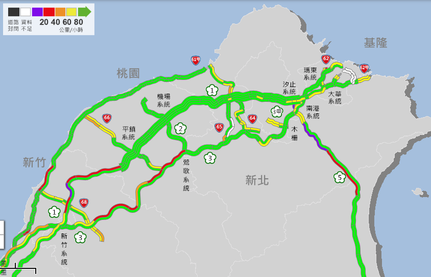 另,國1竹北到新竹、國3龍潭到關西及國5南港到石碇及坪林到頭城,車流量也很大,車速在40到60公里。