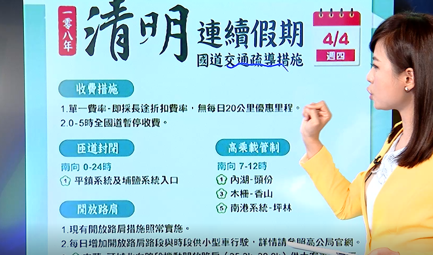 另外,今天全天封閉國1平鎮系統及埔鹽系統南向入口匝道、採單一費率收費、深夜0至5時暫停收費、開放路肩等。