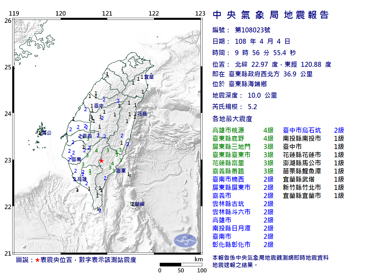 中央氣象局發布顯著有感地震最新消息,今(4)日9時56分,發生芮氏規模5.2有感地震,震央位置在臺東縣政府西北方 36.9 公里 (位於臺東縣海端鄉),震源深度10.0公里。