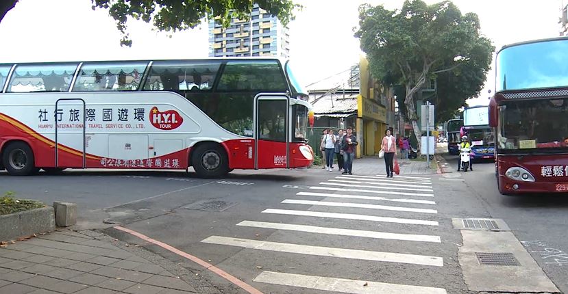 兩三台遊覽車就直接打黃燈,臨停在紅線上,導遊見狀警察靠近,也催促遊客趕緊上車,遠遠看一整條中正路,遊覽車魚貫違停,警察出動,勸導無效只能開單,罰款300到1200元,但是司機其實很無奈。