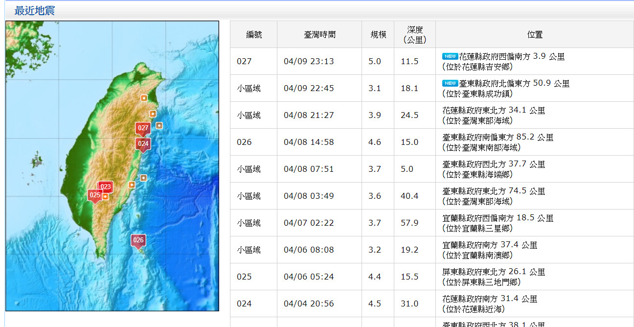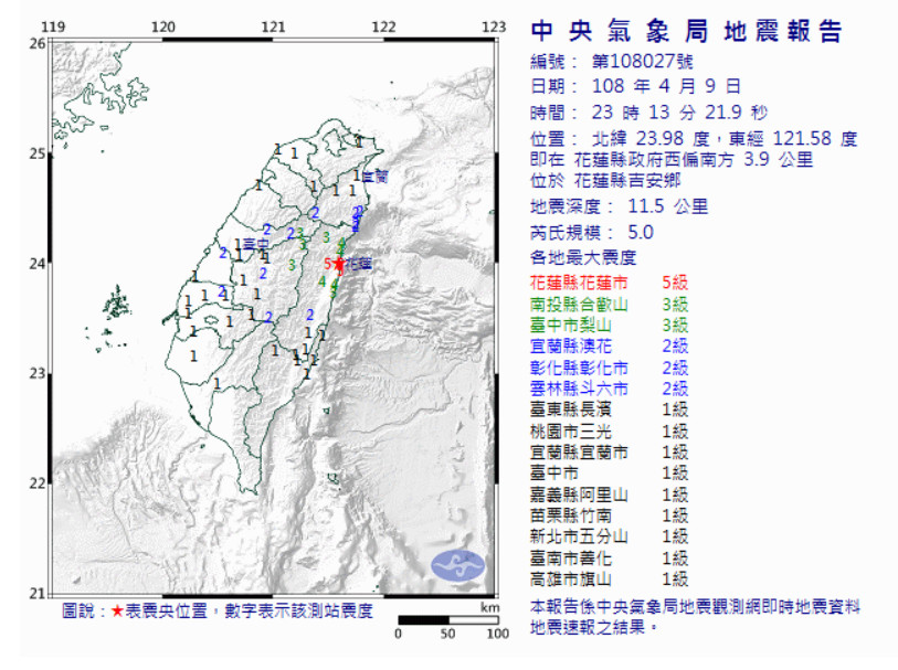 最新消息!花蓮地區今(9)日深夜11時13分發生有感地震,預估4級以上地區:花蓮、北台灣地區都明顯感覺到搖晃,初步推測,花蓮地震發生芮氏規模約5.2地震,深度10公里,氣象局將於稍後更新正式地震報告。