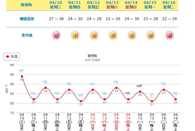 ▼氣象局今天觀測,今天台東縣會有38度高溫出現的機率。(圖/翻攝自中央氣象局)