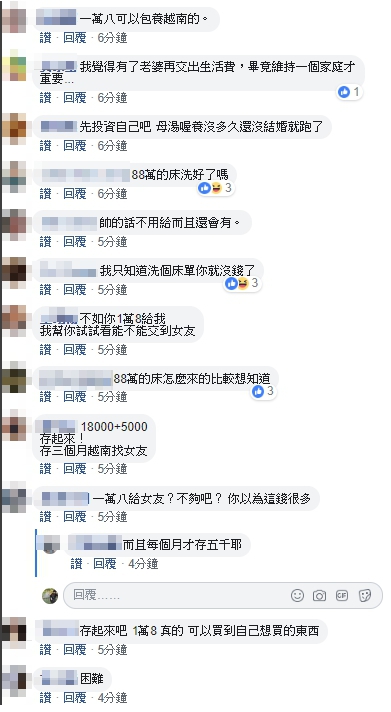 也有人專業分析「不會,因為你沒時間交女朋友」、「給女友1萬八,他只會拿你的錢去找小王而已,你永遠找不到真心的」、「自己存吧~女友是屬於不定數的,若給妻子保管還沒話說,給女友未必會幫你保管,也未必以後會成為你妻子」、「我覺得有了老婆再交出生活費,畢竟維持一個家庭才重要」、「交女朋友不是看賺多賺少,看妳有沒有時間陪她跟對她好不好吧?我有房子車子也沒女朋友呀」、「兩份工作不是長久之際,建議您先存起來,避免您將來沒有兩份工作用」、「如果放債券或股票的收益成長明細,我相信會比放上舊鈔效果更棒」。
