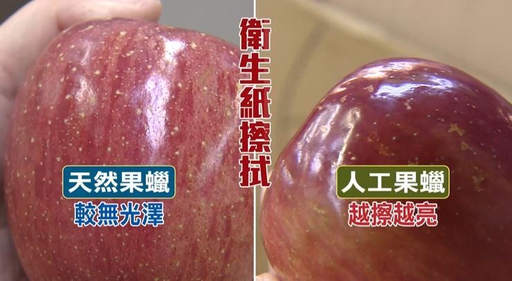 不過像是近距離的日本、韓國,或是台灣自產蘋果,運輸時間短,因此蘋果外皮只有天然果蠟,用刀子刮,果蠟粉末相對少,除了這個方法以外,要分辨是天然果蠟,還是人工食用蠟,還可以這樣做。