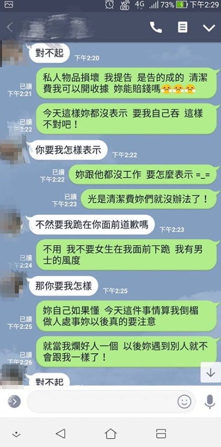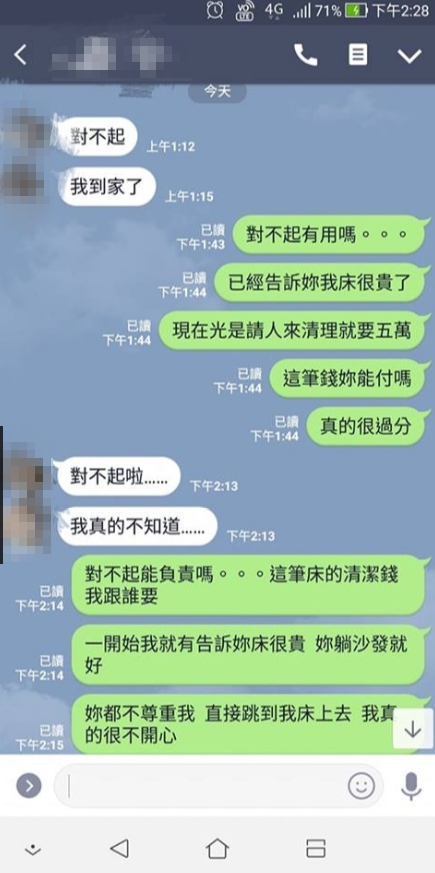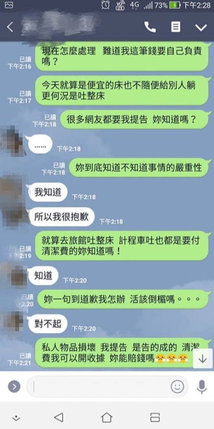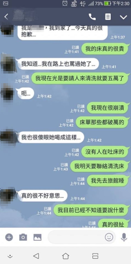 從對話紀錄可以發現,朋友先傳訊息跟他抱歉,怎料他抱怨「光是請人來清洗就要5萬了」、「床單那些都破萬的」,朋友竟完全沒有要賠償的意思,僅表示「我也很傻眼她喝成這樣」、「真的很不好意思」。女子身為罪魁禍首,得知闖下大禍趕緊道歉,但原PO內心怒火難滅,忍不住痛批「難道這筆錢我要自己負責嗎」、「就算去旅館吐床、計乘車吐,也都是要付清潔費的」,但女子依舊不斷道歉,完全沒提到賠償,讓他忍不住感嘆「妳都沒表示,要我自己吞,這樣不對吧」,女子似乎無計可施,乾脆喊話「不然要我跪在你面前道歉嗎?那你要我怎樣?對不起」。